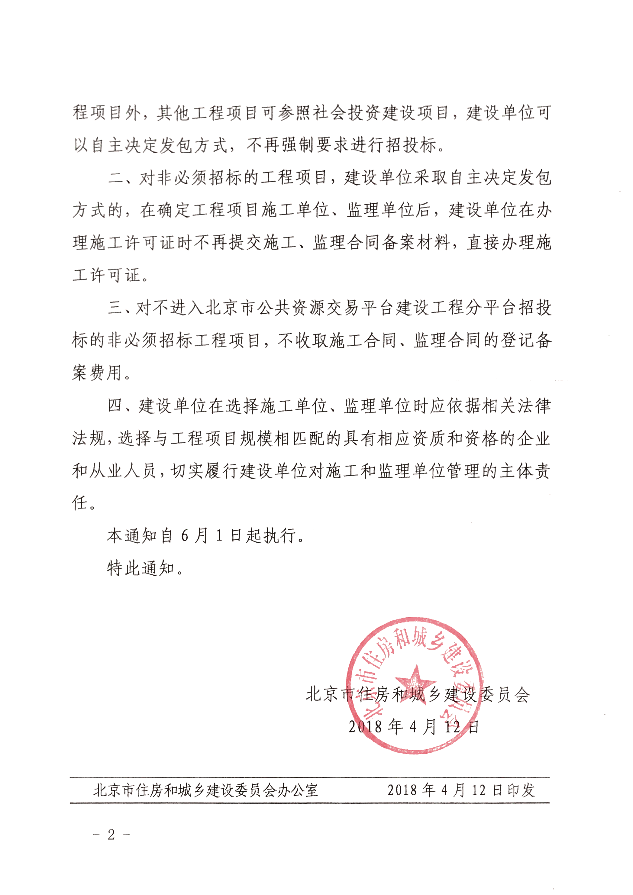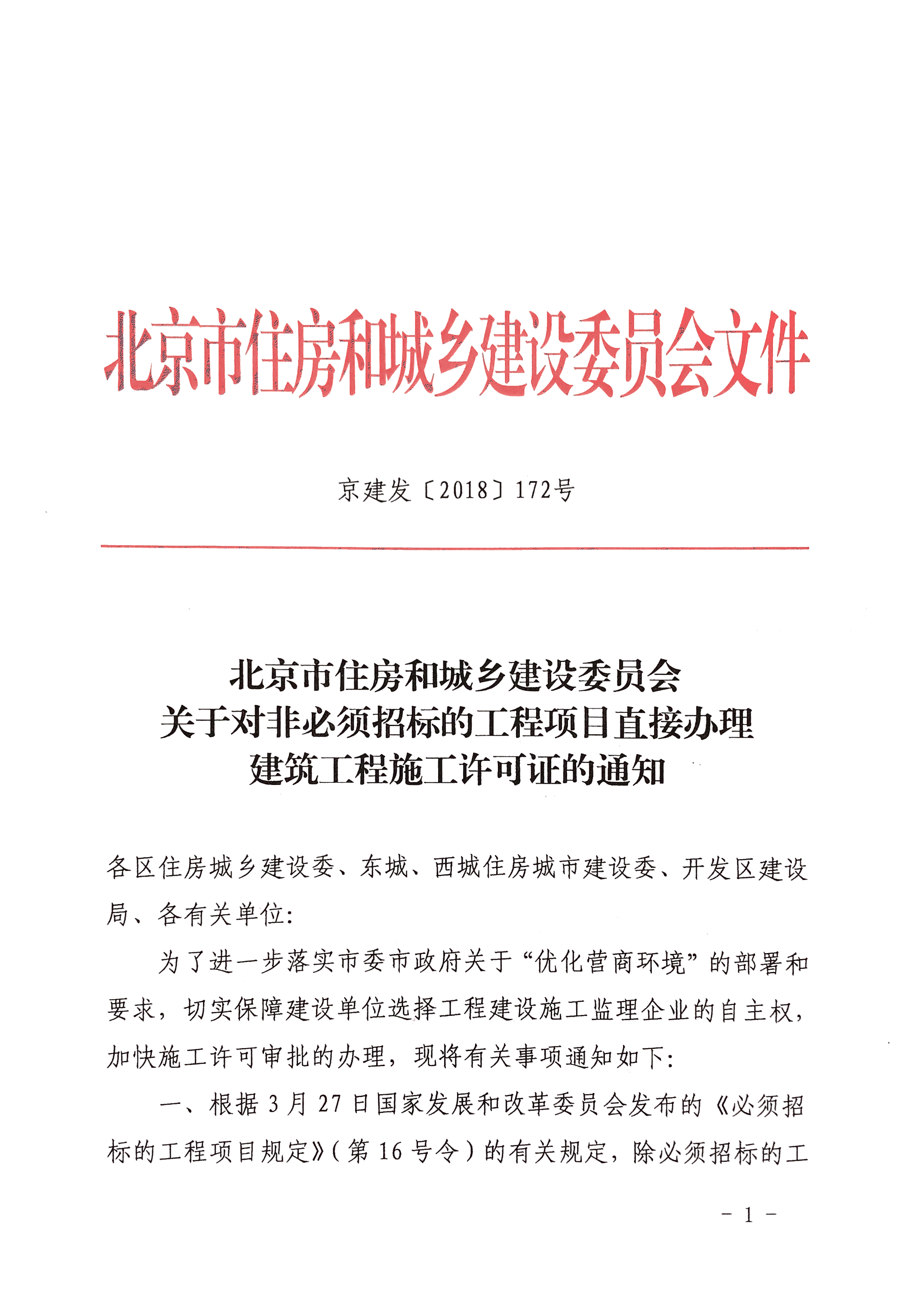 北京市住房和城乡建设委员会关于对非必须招标的工程项目直接办理建筑工程施工许可证的通知