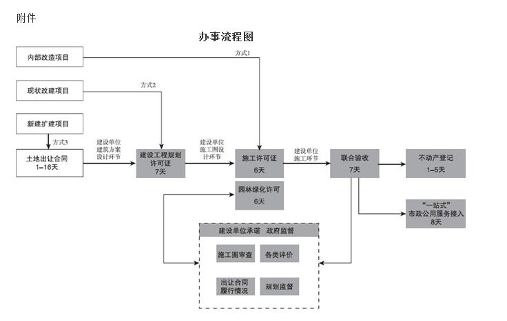 将建设项目按照实施方式分为三类。第一类:内部改造项目,可直接办理施工许可证;第二类:现状改建项目,可直接办理建设工程规划许可证;第三类:新建扩建项目,应签订建设用地使用权出让合同,办理建设工程规划许可证、施工许可证。园林绿化许可和施工许可证并联审批。