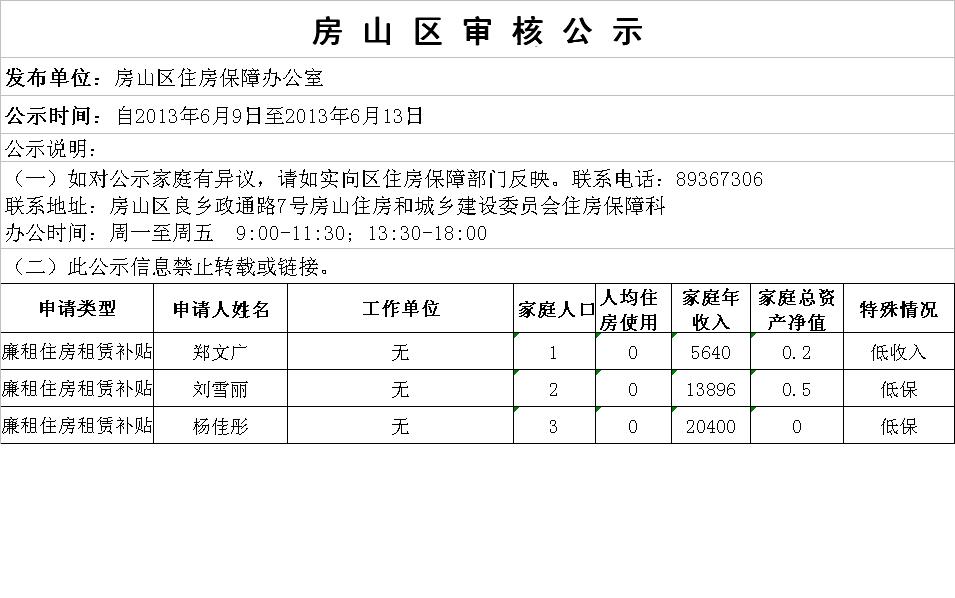 房山区申请廉租住房家庭二次公示名单