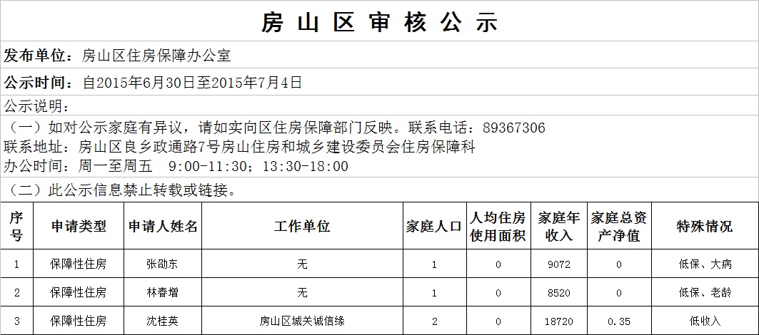 房山区申请廉租住房家庭二次公示名单